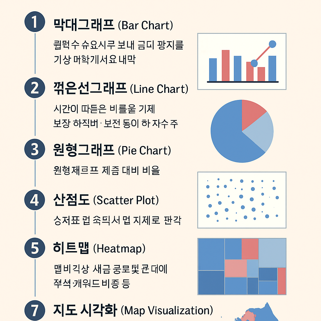 이처럼 각 시각화 방식은 데이터의 성격과 전달 목적에 따라 적절히 선택해야 하며,