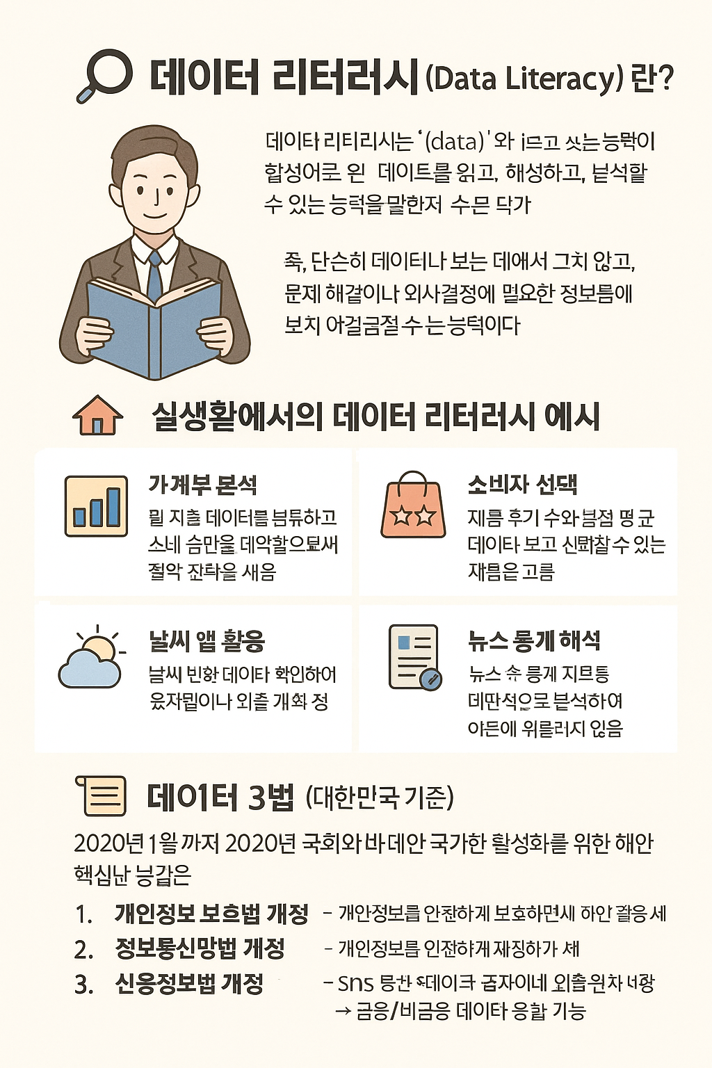 👉 데이터를 읽고, 해석하고, 분석하며, 활용할 수 있는 능력을 말합니다.